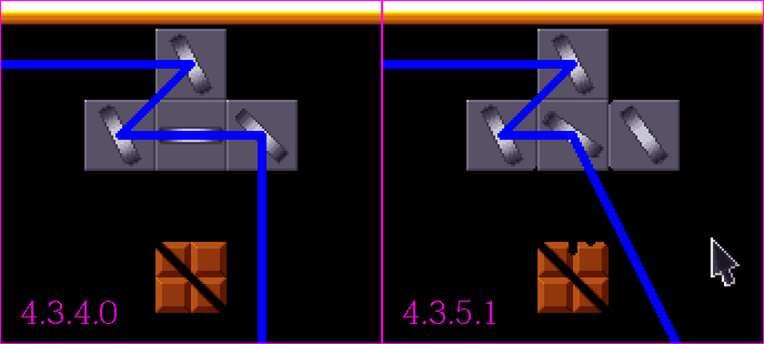 Somewhere around 4.3.4.X versions one certain bug was sorta fixed - black traces which beam leave on some objects like grids and mirrors, these tiny black pixels that chop out some parts of game graphics until the elements themselves are forced to update. But in both 4.3.5.0 and 4.3.5.1, that bug is back and leaves these traces once again. I'll assume some bug fixes forced that bug back into the game, or rather some kind of bug was sort of retrieved as a sacrifice to fix some other bug, I don't know. But it is back.